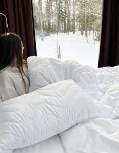 Inside, the blanket features a 100% anti-allergic polyester fiber filling, which helps maintain fluffiness and warmth. The 350 g/m² filling provides an optimal balance between warmth and lightness – the blanket gently adapts to the body without feeling heavy.