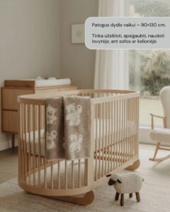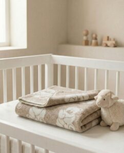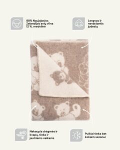 The blanket is made of 88% New Zealand sheep wool and 12% cotton. This combination offers the best qualities of both fibers—wool naturally keeps warm, breathes, and regulates temperature, while cotton adds extra softness and lightness. The blanket is pleasant to the touch, does not irritate sensitive baby skin, and helps maintain a comfortable body temperature both during sleep and while awake.