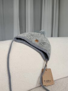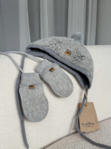The hat gently fits the head, is hypoallergenic, and allows the skin to breathe, ensuring comfort even during longer outdoor time. The inner part is pleasant to the touch, while the fluffy pompom on top adds a playful and charming look. The mittens effectively protect little hands from the cold, and their simple design makes them easy to put on and take off.