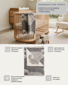 The blanket is made of 88% New Zealand sheep wool and 12% cotton. This combination provides the best qualities of both fibers—wool naturally keeps warm, breathes, and regulates temperature, while cotton adds extra softness and lightness. The blanket is pleasant to the touch, does not irritate sensitive baby skin, and helps maintain a comfortable body temperature both during sleep and while awake.