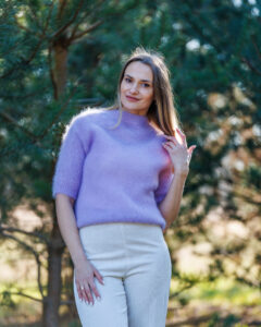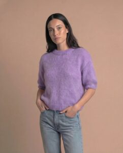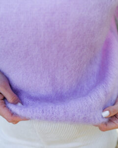 Kid mohair wool sweater Purple is a lightweight, soft, and uniquely styled garment that subtly enhances your look. It features a fluffy, slightly brushed surface that gives it a sense of luxury and coziness.