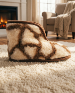 Distinctive Merino wool ankle boot slippers with a giraffe pattern accent – cozy, warm, and playful. The higher shaft gently wraps around the leg, providing extra warmth.