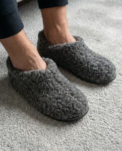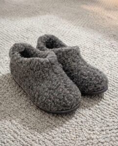 The slippers are made from natural merino wool, known for its excellent thermoregulating properties. Wool provides warmth without overheating the foot, is soft, and pleasant to the skin. It naturally adapts to the shape of the foot, making the slippers suitable for both narrower and wider feet.