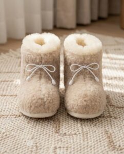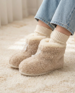 ARA – high, soft, and warm wool boot-style slippers designed for cozy time at home. They gently wrap around the feet and provide comfort on cooler days. The soft, dotted rubberized sole is non-slip and especially stable. A perfect choice for everyday relaxation and comfort.