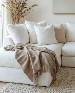 The soft brown color gives the blanket a distinctive look while maintaining a calm, easy-to-match design. Natural shades blend beautifully with various interior colors and add coziness to your home. Light fringes along the edges add a subtle charm.