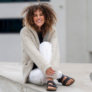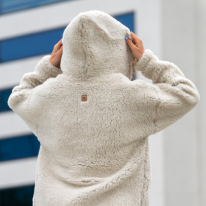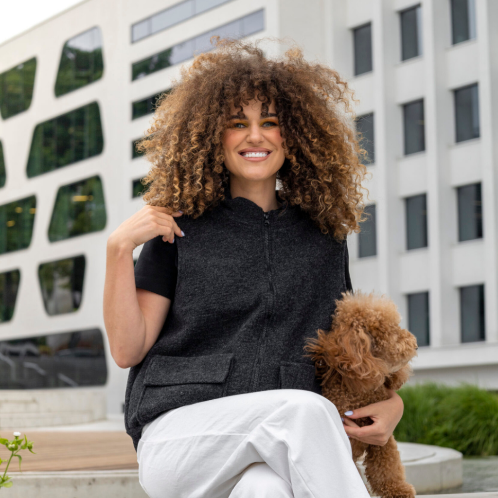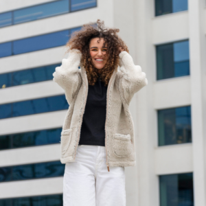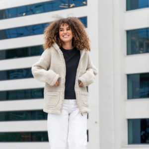 Soft and very warm ladies’ lambswool jacket with a hood. Featuring two small pockets and zip fastening, the design is complemented by eco-friendly leather details.